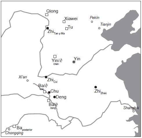 Los ba eran un pueblo que migró muchas veces por el centro y sur de China. En la dinastía Zhou (1046 a.e.c.-256 a.e.c.), los ba tuvieron el título de vizcondado4 hasta el 316 a.e.c., y se ubicaban en las cercanías del actual dis- trito de Fuling, Chongqing, que se encuentra a más de 960 kilómetros de distancia del centro político de la dinastía Shang, la actual ciudad de Anyang. Dong Qixiang (1980) sostiene que “en la antigüedad, el tránsito era difícil, y el trayecto de un ejército en expediciones largas generalmente no solía superar las mil li de distancia”, por lo que 960 kilómetros de distancia era demasiado lejos para los tiempos de la dinastía Shang, y el rey Wu Ding no habría llevado a cabo operaciones militares en un lugar tan lejano. Dong cree que el área de actividad de los ba durante la dinastía Shang debió de haber estado entre los ríos Yangtzé y Han, y compartir frontera con Chu (Xichuan, Henan) y Deng (Dengzhou, Henan). Cui Hengsheng (2001, 135) cree que estaba entre los ríos Han y Dan, área fronteriza con las provincias actuales de Henan, Hubei y Shaanxi; y Chen Mengjia (citado en Xu Mingbo 2006) no está de acuerdo con la transliteración de ba, pero opina que el Estado llamado