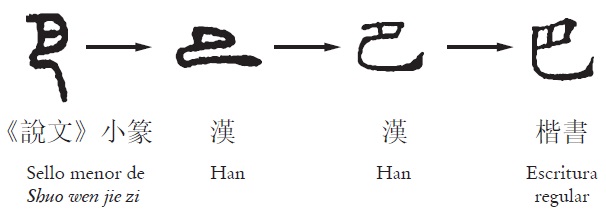 del que estamos hablando. Cao Dingyun (2011) cree que esto se debe al malentendido y la interpretación errónea de Xu Shen (1963). Veamos cómo Li Xueqin (2012, 1274) y Cao Dingyun (2011, 1274, 9) representan la evolución de ba 巴.