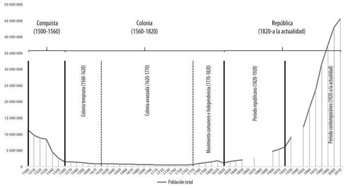 Conquista, 1500-1560. Este período, como adelantábamos, está demarcado entre 1500, año de las primeras exploraciones en el litoral Caribe colombiano, y 1560, punto más agudo de la catástrofe demográfica de la población indígena producida por la conquista española (de un estimado de once millones de indígenas al inicio, se pasa a menos de cinco millones en 1560). Véase la Tabla 1: