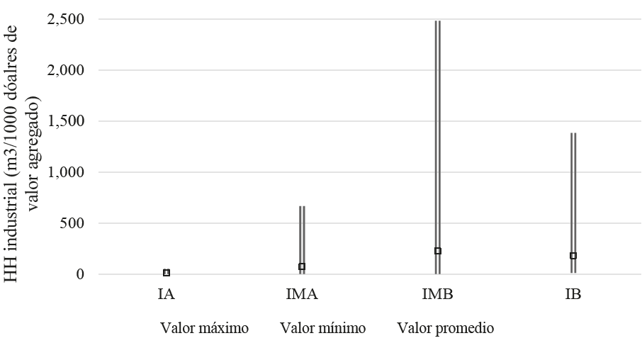 Si se considera la huella hídrica por unidad de valor agregado manufacturero y el hecho que los países de ingreso alto son los de menor consumo de agua per cápita, el patrón anterior también sugiere que este grupo de países es más eficiente en el uso del agua. En este sentido, el consumo de agua para generar mil dólares de valor agregado representa apenas el 14% de la consumida por los países con ingreso medio-alto, 4.4% la de países LMI y 5.5% la de países de bajo ingreso, lo que contrasta con los hallazgos de Hoekstra y Chapagain (2007)). En concreto, los países de ingreso medio-bajo son los de mayor huella hídrica por mil dólares de valor agregado, seguidos por los países de bajo ingreso y los de ingreso medio-alto. Adicionalmente, los valores máximos y mínimos de la HH manufacturera de este grupo son todos menores a estos mismos valores de los otros tres grupos de referencia (figura 2).