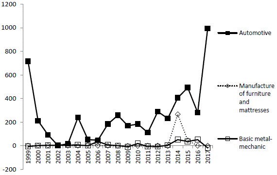 The massive entry of foreign investment in manufacturing activities in the region under study began in 1999. Although investment increased steadily in the three states from 1999 to 2017, as figure 2 shows, in each state the investment had a specific trajectory.
