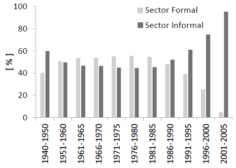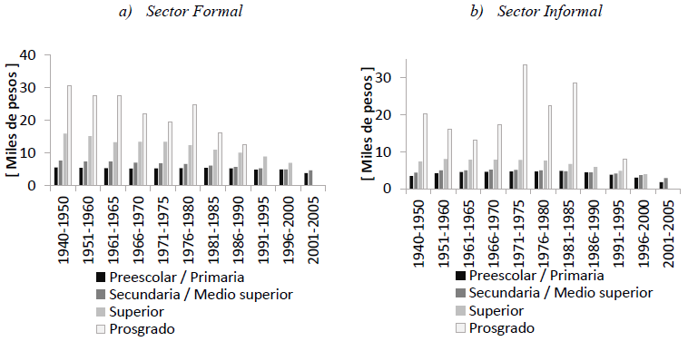 En el caso de los trabajadores en el sector informal se observa que las personas perciben un ingreso superior al ingreso de la primera cohorte, excepto para las personas nacidas a partir de 1996. De hecho, las últimas dos cohortes (1996-2000 y 2001-2005) son los que trabajan en promedio menos horas a la semana (37.1 y 30.7 horas a la semana) y el ingreso por hora es aproximadamente de 94.01 y 79.84 pesos, respectivamente. Estas dos cohortes son los más jóvenes de la muestra, lo que implica que las personas menores de 25 años trabajan menos horas y perciben menos ingresos que en el sector formal.