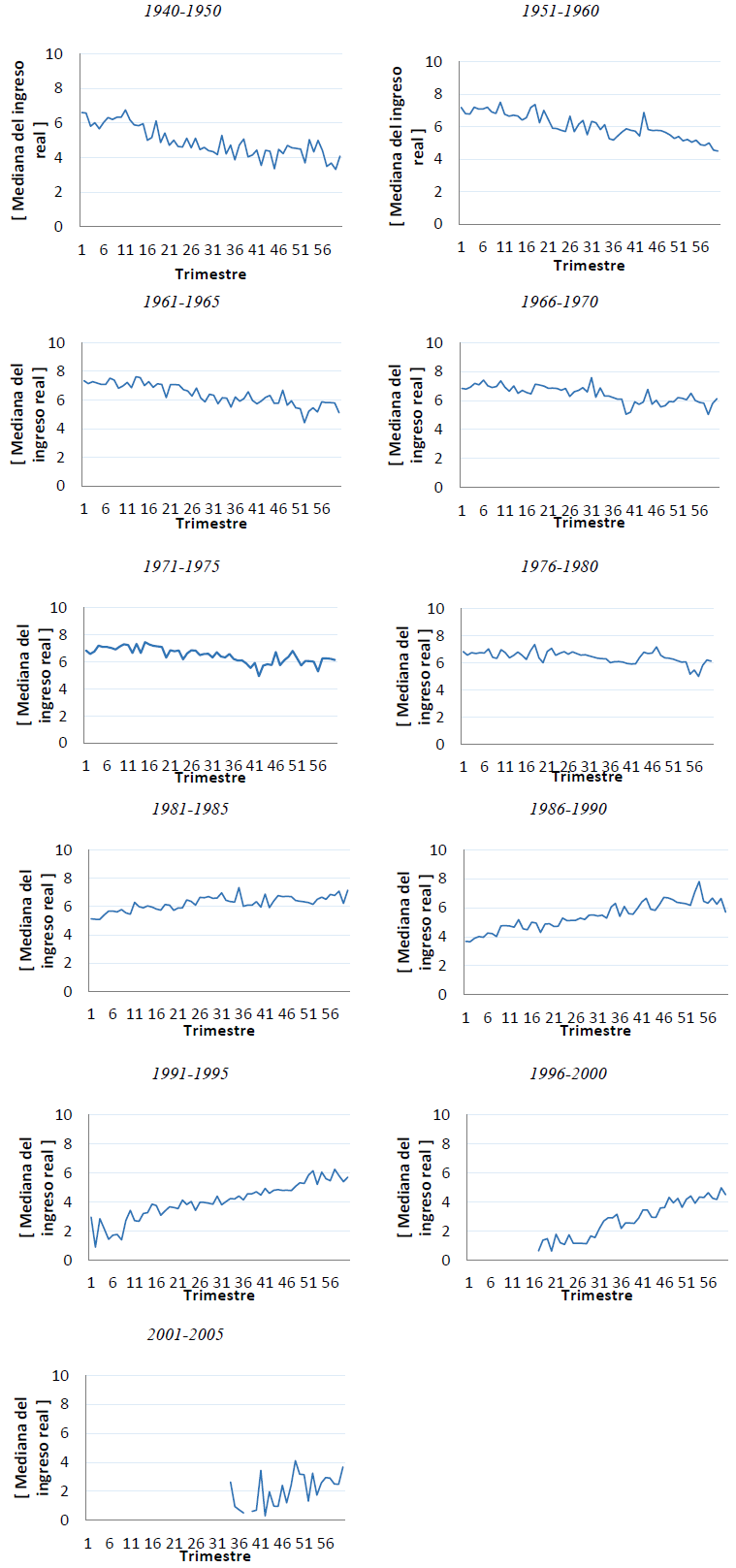 En la gráfica 4 se muestra la tendencia de los ingresos por cohortes. Encontramos que en las primeras tres cohortes (1940-1950, 1951-1960 y 1961-1965) se observa una tendencia negativa en la media de ingresos reales mensuales. Por otro lado, la mediana del ingreso real de las siguientes tres cohortes (1966-1970, 1971-1975 y 1976-1980) empieza a estabilizarse; es decir, su pendiente es cercana a cero. A partir de la cohorte de 1981-1985 y hasta la cohorte más reciente, la mediana del ingreso real tiene una pendiente positiva y, por lo tanto, su poder adquisitivo ha aumentado.