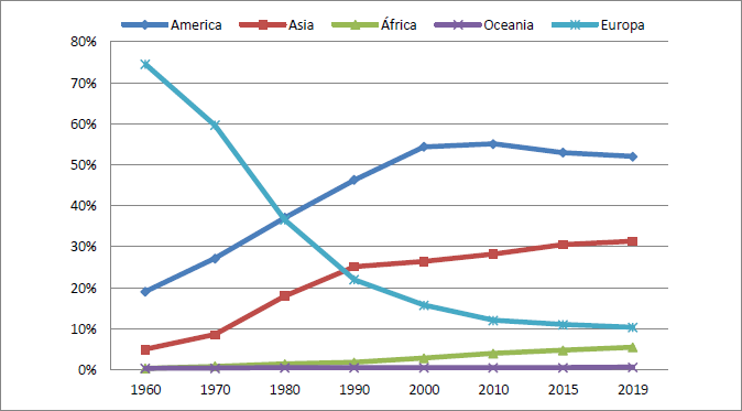 La Gráfica 2 muestra la composición, por continente de procedencia, de la población inmigrante en los Estados Unidos. Como se puede apreciar, para la década de 1960, los inmigrantes procedentes de países del continente americano representaban un lejano segundo lugar, llegando a ser sólo el 19% del total de los inmigrantes. Posteriormente, para 1980 el porcentaje de los emigrantes europeos había descendido hasta prácticamente empatarse con el de los americanos. En 1990, América se posicionó como el primer lugar de procedencia de inmigrantes, alcanzando el 46%, lugar que mantuvo hasta el 2019. En esa misma década, Asía empezó sostenidamente una tendencia creciente, hasta alcanzar históricamente el 31%. Por su parte, la tendencia de los inmigrantes Europeos se conservó descendiente hasta el 2019.