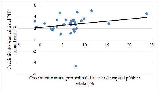 Gráfica 2 Crecimiento promedio del PIB estatal y crecimiento promedio del acervo de capital público a nivel estatal en México