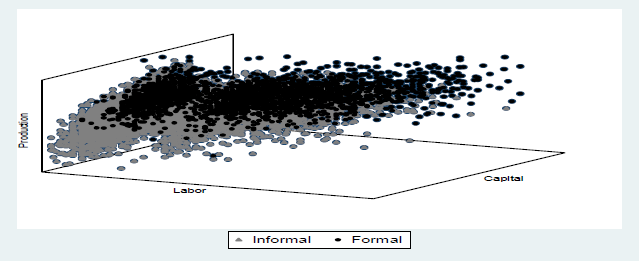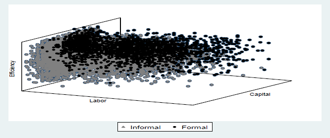 To compare and highlight the efficiency differences between informal and formal micro-firms, Figure 1 and Figure 2 show the results of graphing the main variables (capital and labor) with efficiency and output for both formal and informal micro-firms. In the three figures, formal micro-firms (represented by the black dots) are located higher than the informal micro-firms (represented by the grey dots), indicating greater efficiency and production. In addition, Figure 3 shows the efficiency differences in terms of the density distribution; in each figure, the density graph on the left corresponds to informal microenterprises, and the density graph on the right corresponds to formal microenterprises; in this way, it is possible to compare both graphs visually. It is confirmed that formal and informal micro-firms exhibit different behavior in terms of efficiency and output.