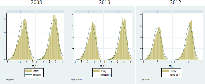 The importance of the education variable in explaining efficiency differences between formal and informal micro-firms is strengthened by these results. The variable explains most of the efficiency differences, with a coefficient of 0.012 in 2012. This result is like that found by other authors (La Porta and Shleifer 2008; Gennaioli et al., 2013; Akoten et al., 2006; Gelb et al., 2009), who recorded the same importance and significance of this variable.