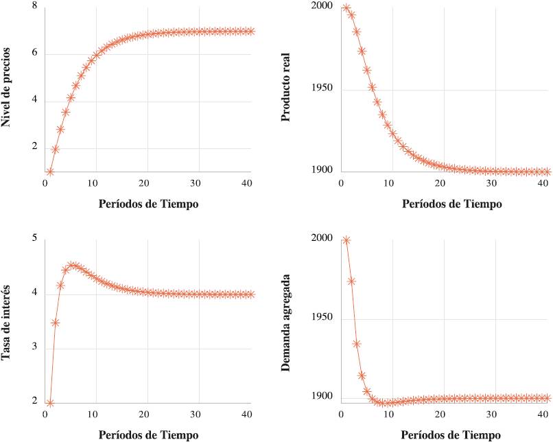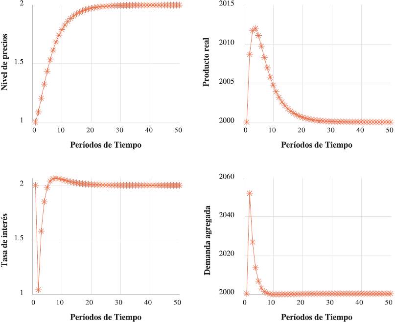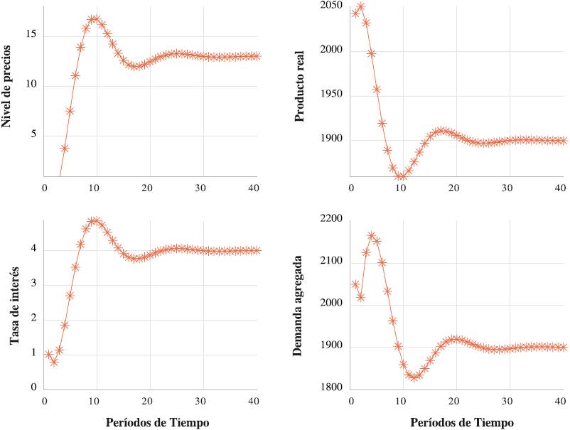 La Gráfica 3 ilustra el impacto de un incremento en la tasa de emisión monetaria de un 1%. Los efectos se reflejan en el nivel de precios, este aumenta de 1 hasta 7 en un lapso aproximado de 30 períodos; sin embargo, lo más importante de la tasa de emisión monetaria son sus efectos permanentes. La tasa de interés, la demanda agregada y la producción real alcanzan valores distintos de su estado estacionario inicial. La tasa de interés ya no regresa a su nivel inicial de 2, sino que después de una sobrerreacción se estabiliza en un nivel de 4 después de aproximadamente 20 períodos. Esto tiene consecuencias permanentes en la producción y la demanda agregada. Estas dos variables disminuyen de 2000 hasta 1900 en un lapso de tiempo más pronto de lo esperado. La explicación reside en la ecuación (4), que representa a la curva de Phillips. La inflación se desvanece