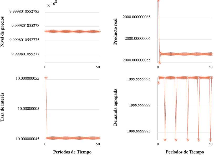 La gran diferencia en esta economía ‘keynesiana’ es un nivel de precios ‘más inflado’. Esto se explica por la mayor elasticidad de la demanda de dinero a la tasa de interés. Pero, por otro lado, el valor inicial de las demás variables endógenas es prácticamente idéntica al de una economía ‘monetarista’.