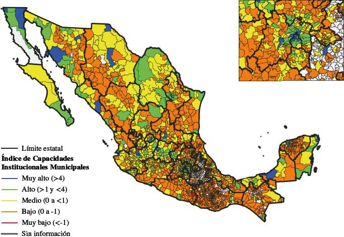 Los municipios con capacidades institucionales altas (verdes) son 164. Estos municipios y los municipios con muy alto ICIM conforman regiones con potencial de crecimiento y atracción de inversión y capitales, por ser los que poseen mayor infraestructura productiva, pero, son también los municipios donde se concentran los mayores problemas de inseguridad y déficit en los servicios básicos como la distribución del agua, lo cual restringe sus potencialidades de desarrollo. En algunos de ellos destacan además capacidades gubernamentales débiles, como es el caso de Ecatepec e Iztapalapa.