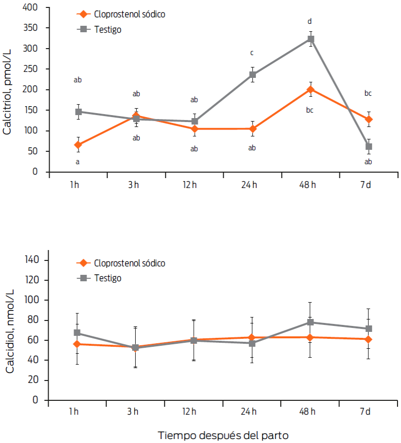 Figura 2 Concentraciones séricas de calcitriol y calcidiol en vacas lecheras tratadas con 500 µg de cloprostenol sódico a las 1 y 48 horas postparto (n = 10) y testigo (n = 10) (media ± DE). La interacción tratamiento x tiempo fue significativa (P < 0.05) para la concentración sérica de calcitriol. Medias con literales distintas son estadísticamente diferentes (ajuste por Bonferroni; P < 0.05).