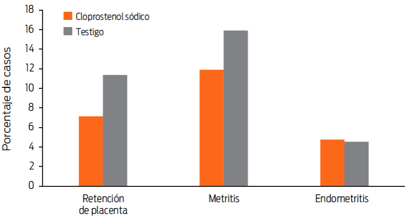 No hubo diferencia estadística entre los grupos para las variables retención de placenta (P = 0.15), metritis (P = 0.15) y endometritis (P = 0.8) (Figura 3).