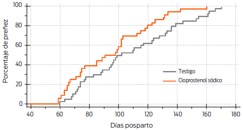 La media y la mediana de días abiertos fue de 94.66 ± 4.4 y 98, respectivamente, en el grupo tratado con cloprostenol sódico, y de 107.9 ± 4.9 y 100.5 en el grupo testigo. El análisis de supervivencia mostró una diferencia estadística entre los tratamientos (P = 0.02; Figura 4).