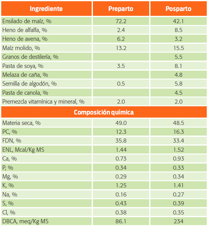 Este trabajo se realizó en un rancho comercial de 3 200 vacas Holstein, con una producción promedio de 10 845 L por lactación, cerca de la ciudad de Torreón, Coahuila, México. Las vacas se alojaron en el mismo corral antes y después del parto, donde recibieron una dieta integral y agua ad libitum (Cuadro 1).