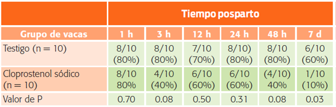 Se utilizaron 80 vacas Holstein multíparas, las cuales se dividieron aleatoriamente en dos grupos. A las vacas del grupo 1 (n = 38) se les administró 500 µg de cloprostenol sódico vía IM en la primera hora posparto y una segunda aplicación 48 horas después. El grupo 2 fue el testigo (n = 42). En 10 animales de cada grupo se tomaron muestras de sangre 1, 3, 12, 24 y 48 horas después del parto, y a los 7 días posparto. Se registró la incidencia de retención de placenta, metritis, endometritis y número de días abiertos.