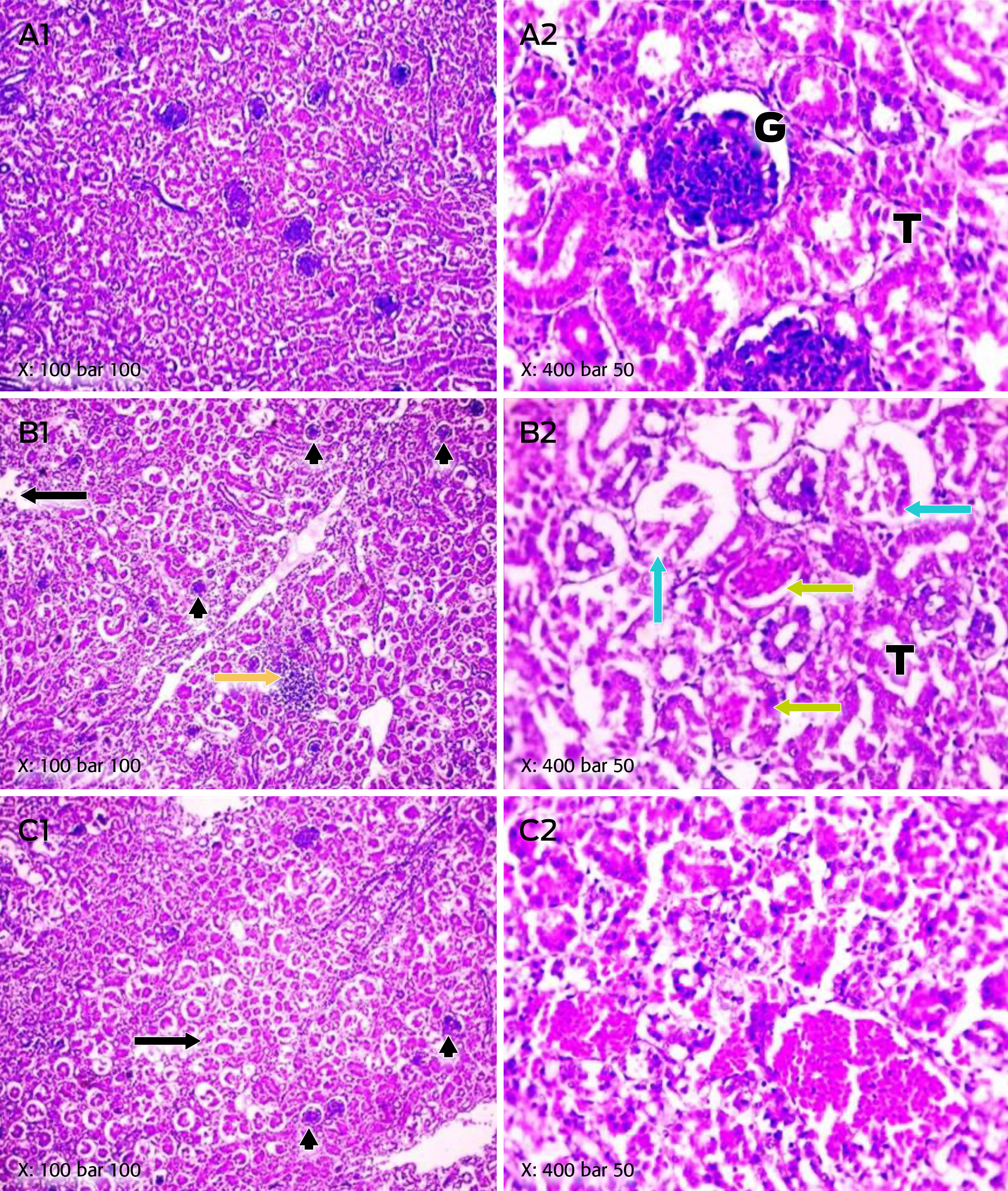 Microscopic pictures of hematoxylin and eosin stained renal sections showed normal arrangement of glomeruli (G), tubules (T) and interstitial tissue in control broiler group (Figure 2: A1-A2). Likewise, kidneys of cobb broiler chickens treated with T-Nil Plus® showed lymphocytic follicular aggregation (yellow arrow), mild interstitial edema (black arrow), small shrunken glomeruli (black arrowheads), red blood cells casts (green arrows) and desquamated and separated renal epithelium (blue arrows) (Figure 2: B1-B2). Moreover, kidneys of cobb broiler chickens treated with Synertox® showed small shrunken glomeruli (black arrowheads), mild interstitial edema (black arrow), congested interstitial blood vessels (red arrows) (Figure 2: C1-C2).