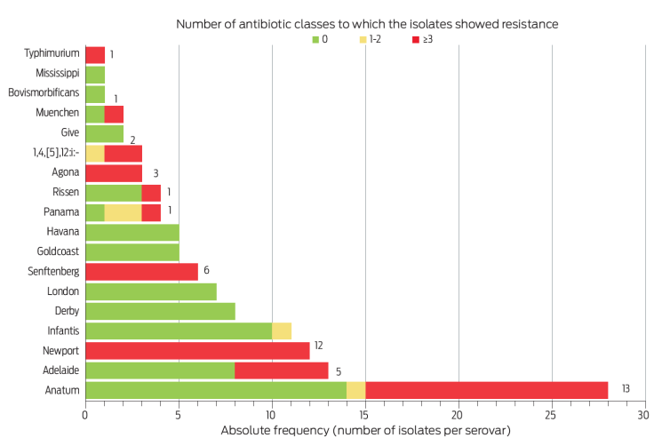 The AMR phenotype of isolates was determined by the Kirby-Bauer disk diffusion technique.18 We used a panel of 12 antibiotics included in the WHO list of critically important antimicrobials for human medicine.19 This panel included antibiotics that are intensively used in human or veterinary medicine as well as drugs that are used to treat invasive salmonellosis or serious infections caused by enterobacteria (Table 2).