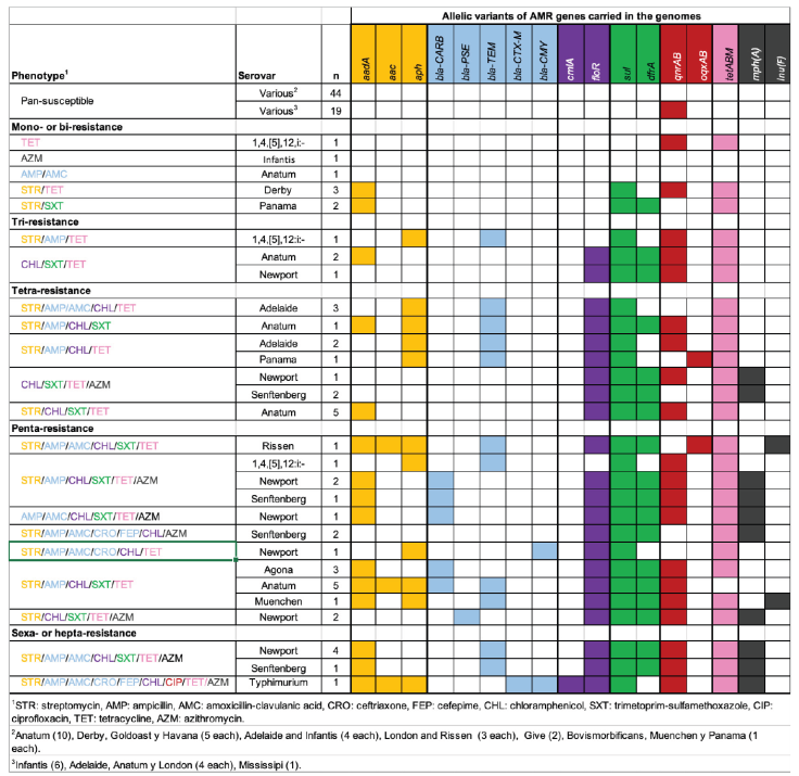 Our results suggest that SE populations are massively acquiring AMR genes against antibiotic classes that are used in both human and veterinary medicine. In addition, the wide repertoire of AMR genes against the antibiotic classes considered here suggests that the pathogen is exposed to these drugs in the production setting. Of particular importance is the apparent emergence of azithromycin resistance, which is one of the few alternatives to treat invasive salmonellosis. To date, this phenotype has rarely been found in foodborne SE in Mexico.3