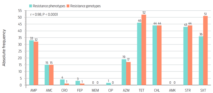 Figure 6 Correlation between AMR phenotypes and genotypes of the sequenced isolates (n = 116). STR: streptomycin, AMP: ampicillin, AMC: amoxicillin-clavulanic acid, CRO: ceftriaxone, FEP: cefepime, CHL: chloramphenicol, SXT: trimetoprim-sulfamethoxazole, CIP: ciprofloxacin, TET: tetracycline, AZM: azithromycin.