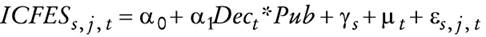 en la que ICFESs,j,t son los resultados promedio de la prueba que obtuvieron los alumnos de la escuela s ubicada en el municipio j durante el periodo t; Dect denota una variable que representa el número de años en el momento t que han transcurrido desde que se emprendieron las reformas de descentralización y Pub es una variable ficticia o dicotómica igual a uno si la escuela s es pública. Al igual que en los estudios anteriores, incluimos el efecto de descentralización en esta forma específica dado que los cambios de políticas toman tiempo y sus efectos pueden ser acumulativos.11 Todas las regresiones también incluirán γs, que controla por todas las características invariantes en el tiempo de la escuela s, como son la infraestructura de las escuelas; μt, que capta los efectos fijos de año comunes a todas las escuela, y εs,j,t, que representa un error independiente e idénticamente distribuido no observado.12
