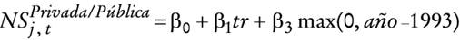 Para comprobar esta posibilidad, tomamos la especificación (5) y empleamos como variables de pendientes el número total de alumnos de escuelas públicas y privadas que presentaron la prueba ICFES cada año desde 1980. Para cada sector, supusimos un intervalo distinto en las tendencias para cada uno de esos 20 años. Los resultados de la comparación de todos los estadísticos t sugieren que el intervalo de la tendencia ocurrió en 1993 para los alumnos de escuelas públicas.23