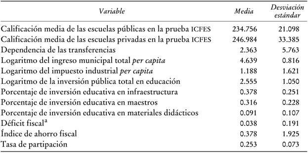 La información empleada en este artículo proviene de tres fuentes de datos distintas: los resultados de los exámenes aplicados a alumnos de preparatoria, los datos fiscales municipales y los datos políticos referentes a las elecciones de alcaldes de cada municipio. Los resultados de los exámenes se tomaron de la prueba ICFES. Este es un examen que aplica el gobierno dos veces al año y que evalúa aproximadamente a 90% de los alumnos de preparatorias colombianas en las materias de matemáticas, español y ciencias al concluir el último año de preparatoria.16 A pesar de que la información por estudiante para el periodo 1980-1999 está disponible, los años 1986, 1988 y 1991 se excluyeron de la evaluación debido a que para esos años únicamente estuvieron disponibles los resultados de una de las dos rondas de exámenes.17 Tomada en conjunto, tenemos información de los resultados de las pruebas de más de tres millones de estudiantes. Posteriormente, esta in formación se usa para armar la calificación promedio de los exámenes de cada escuela y cada año durante el periodo de dos decenios.18