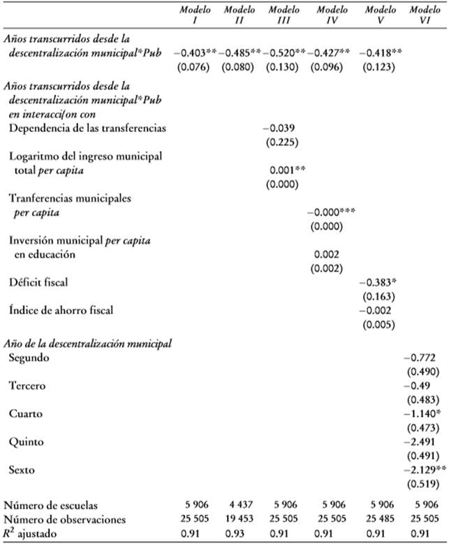 a Todas las especificaciones incluyen los efectos fijos de escuela y tiempo. Aunque no se muestran, también están incluidas las variables de control adicionales, como la dependencia de las transferencias, el logaritmo del ingreso municipal per capita, las transferencias municipales, la inversión de los municipios en la educación, el porcentaje de inversión en infraestructura escolar, el porcentaje de inversión en maestros, el déficit fiscal, los ahorros fiscales y la variable ficticia del partido de los alcaldes. Los errores estándar sólidos corregidos por grupo a nivel de municipio/año se muestra entre paréntesis.