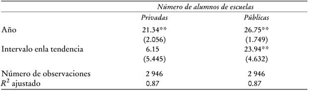 Sin embargo, el asunto es distinto respecto al número de alumnos que asisten a escuelas públicas. La segunda columna del Cuadro 3 muestra los resultados de cuando empleamos como variable dependiente el número de alumnos de escuelas públicas que presentan la prueba. En este último caso, el intervalo en el coeficiente de la tendencia es tanto positivo como significativo, lo cual sugiere que el número de alumnos de escuelas públicas que presentaron la prueba ICFES aumentó significativamente desde 1993.24