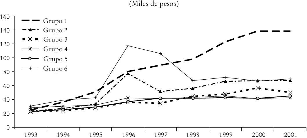 Gráfica 2 La evolución de los impuestos municipales totales per capita por grupos de municipios