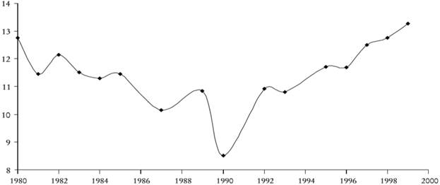 Las Gráficas 3 y 4 ilustran la evolución de la media total de las calificaciones de la prueba ICFES de las escuelas públicas y privadas durante el periodo 1980-1999, así como su brecha media, respectivamente. Claramente, en promedio, los alumnos de las escuelas privadas obtuvieron mejores resultados en esta prueba que los alumnos de las escuelas públicas. Asimismo, después de las reformas de descentralización de 1993, se revirtió la tendencia descendente en la brecha de la calidad entre escuelas públicas y privadas.19