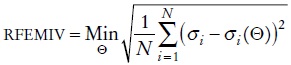 En la expresión anterior σi es la volatilidad implícita de Black, Scholes y Merton, que se obtiene al invertir la fórmula de BSM e igualarla a precios de mercado, y σi (Θ) es la volatilidad implícita de BSM obtenida al invertir la fórmula de BSM e igualarla a precios obtenidos con el modelo teórico.