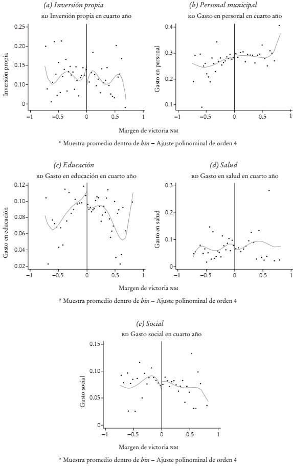 Los resultados iniciales muestran que no existen efectos de la identidad política del alcalde sobre las variables estudiadas, lo que es contrario a la hipótesis planteada. Una primera estimación por OLS muestra que una municipalidad en la que se elige un alcalde de la coalición de centro-izquierda gasta 2.2% menos en educación que una municipalidad con un alcalde de la coalición de centro-derecha, mientras que para inversión propia, gasto en personal, salud y programas sociales, no hay diferencias según la coalición del alcalde. Sin embargo, las estimaciones mediante diseño RD muestran que no existe un efecto de partido político significativo para las cinco variables estudiadas.