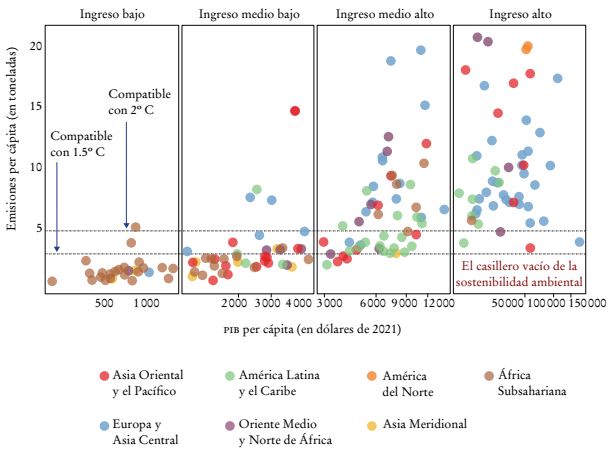 El casillero vacío de la sostenibilidad ambiental muestra que un mayor ingreso está asociado con una más grande huella ambiental. Si se toman las emisiones de gases de efecto invernadero (GEI) como una de las expresiones de la degradación ambiental, es posible comparar las actuales emisiones por habitante con el nivel consistente para limitar el aumento de temperatura a 2 y 1.5 °C, objetivos establecidos por la comunidad internacional para evitar los peores efectos del cambio climático, y, como muestra la Gráfica 1, son pocos los casos de países con un producto interno bruto (PIB) per cápita mayor a 12 000 dólares cuyos niveles de emisiones por habitante no superen estos límites.