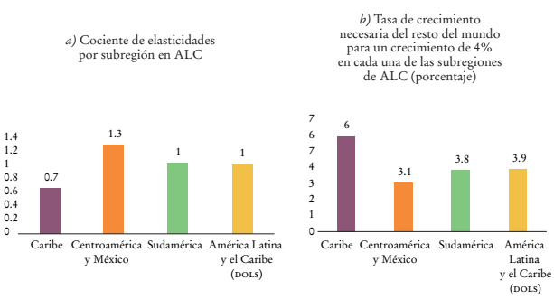 Adicionalmente, se ensayó la estimación de una ecuación que incluye una variable categórica para obtener las elasticidades para cada subregión: el Caribe, Centroamérica y México y Sudamérica. Las elasticidades se presentan en el Cuadro 4.