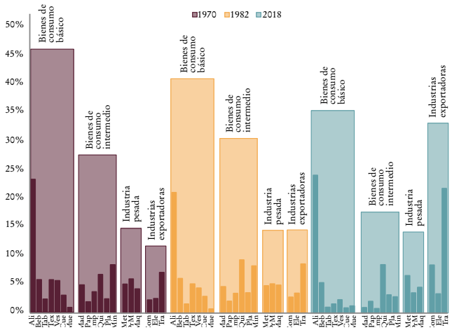 Para 1970, la estructura de la manufactura es reflejo de las características del proceso de industrialización por sustitución de importaciones de las décadas anteriores, destinado a atender el mercado interno. En su composición escalonada, es visible la preponderancia de los bienes de consumo básico que cubren cerca de la mitad del producto de la manufactura (46.2%). Los bienes de consumo intermedio alcanzan un peso importante (27.5%) que revela los avances de encadenamientos intermedios, en particular de productos a base de minerales no metálicos (insumos básicos de la construcción) y de la industria química. La participación de las industrias pesadas se aproxima a 15%, gracias a las metálicas básicas y los productos metálicos. La producción de maquinaria y equipo es exigua y muestra la consabida dependencia estructural que se mantuvo en este sector. Lo que ahora clasificamos como ramas altamente exportadoras en ese entonces atendía básicamente la demanda interna de bienes de consumo duradero. Su contribución en conjunto era de algo más de 11 por ciento.
