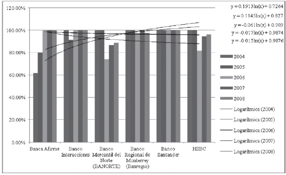 Por lo que corresponde a los indicadores de eficiencia, los bancos que presentan una eficiencia perfecta (100%) son Banco del Bajío, Banco Inbursa, Banco Nacional de México (BANAMEX), BBVA Bancomer, Scotiabank Inverlat, Banco JPMorgan e ING Bank. Banca Afirme (88.06%), Banco Interacciones (98.28%), Banco Mercantil del Norte (BANORTE) (89.92%), Banco Regional de Monterrey (Banregio) (98.98%), Banco Santander (99.52%) y HSBC (94.62%), son los bancos con algún nivel de ineficiencia en los años de estudio.