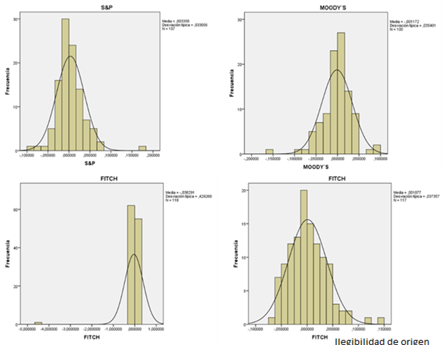 Igualmente, una técnica que permite el análisis es el histograma de distribución normal; para el caso de la agencia calificadora S&P se observa que la distribución del CAR tiende a concentrarse al lado izquierdo lo que indica una distribución asimétrica a la derecha con tendencia positiva, es decir, media> mediana, con mayor concentración de datos en el rango de -0,00001615 y 0,00335760; por lo tanto, los retornos anormales se concentran cerca del punto de referencia que es cero. Para el caso de Moody´s se tiene una distribución con tendencia a concentrarse al lado derecho; presenta una distribución asimétrica a la izquierda con tendencia negativa, es decir Media