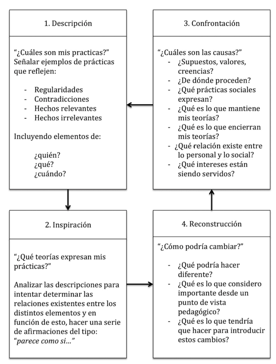 El ciclo de reflexión de Smith (1991), está compuesto de cuatro fases o etapas: a) descripción, b) inspiración, c) confrontación y d) reformulación. A continuación, se muestra este proceso, enfatizando en los aspectos relativos a la reflexión realizada por el formador.