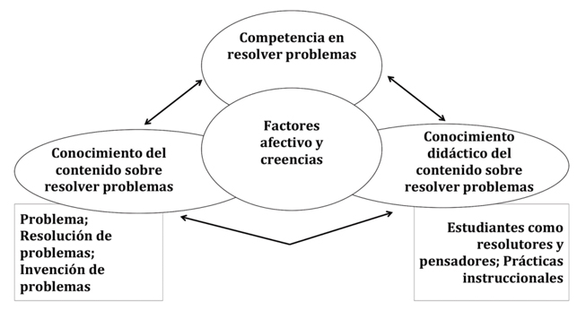 En este contexto, aún no existe una sistematización sobre qué debe saber un profesor para enseñar la resolución de problemas. Chapman (2015) realiza un primer intento partiendo del modelo Mathematical Knowledge for Teaching (MKT) (Ball, Thames y Phelps, 2008). En esta sistematización, se recurrió a las principales investigaciones en torno a la resolución de problemas. De acuerdo con esta autora, la enseñanza de la resolución de problemas es un sistema que se relaciona estrechamente (ver figura 2). El marco de Chapman (2015) se compone de la competencia del profesor para resolver problemas, conocimientos del contenido (sobre problemas, resolución e invención de estos) y didácticos del contenido (sobre los estudiantes como resolutores y prácticas de enseñanza). Además, en una dimensión aparte, se encuentran los factores afectivos y creencias que tienen incidencia en la enseñanza de esta competencia.