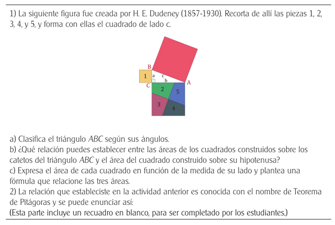 En la línea 9 el EPM3 pide a los alumnos que enuncien esa relación con sus palabras. Los alumnos realizan aportes (L10: los cuadrados menores; L11: poner letras a los cuadrados; L30: usando colores para distinguir los cuadrados; L40: numerando los cuadrados). Aunque los estudiantes han generado el enunciado que el EPM3 quiere establecer, el modo en que este pretende que lo hagan genera por momentos sugerencias propias del patrón extractivo-embudo. En efecto, el docente realiza tres intentos (L12, L16, L21-L29) de que los alumnos llamen a los cuadrados involucrados en la tarea cuadrados construidos sobre los catetos y cuadrado construido sobre la hipotenusa. De forma especial entre las líneas 21 y 29, el EPM1 va preguntándoles cuáles de los lados son los catetos del triángulo ABC, y cuál la hipotenusa, para preguntar nuevamente cómo pueden enunciar dicha relación. Sin embargo, en la línea 30, E9 propone usar colores para distinguir los cuadrados, cosa que el EPM3 parece aceptar, pero luego se inclina por la propuesta de numerar la mayoría de los cuadrados. La relación se establece en los siguientes términos: Si sumamos las áreas de las figuras numeradas del 1 al 5, se obtiene el área del cuadrado rojo. Una vez llegados a esta conclusión, para la que los estudiantes tienen adjudicado un significado originado en el rompecabezas que armaron, el EPM3 trabaja con ellos para que enuncien la misma relación usando las medidas de los lados del triángulo: a, b y c, que es la parte 1c) de la actividad. Guiados por sus preguntas, los alumnos van diciendo cuáles son las expresiones de las áreas de cada cuadrado, y finalmente se escribe en el pizarrón: a 2 + b 2 = c 2. El EPM3 les dice que esta relación se conoce como el Teorema de Pitágoras. A partir de eso, el EPM3 dicta el enunciado del teorema.