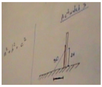 | 6 | EPM3: Aja, a ver si a esta medida le llamo x por ejemplo. (Escribe x debajo del cateto horizontal). Vuelvo a preguntar, ¿no conocen algún vínculo (señala la igualdad a2 + b2 = c2) entre las medidas de los lados de un triángulo rectángulo? Más explícito imposible. |