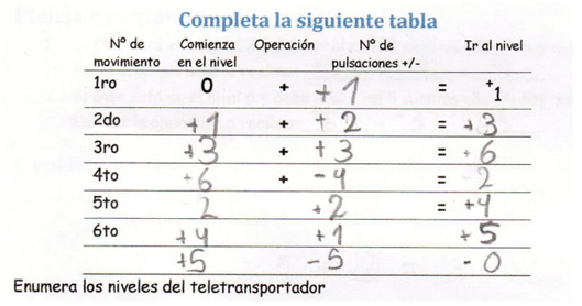 Al comienzo de las actividades, Martina aplica una estrategia de completar la tabla antes de indicar los desplazamientos del ascensor mediante el conteo. Esto se debe a la motivación de no cometer errores y perder, ya que al momento de subir o bajar el ascensor debe realizar el cálculo. Se le pregunta por esta situación: "¿Por qué estás realizando la tabla?" La respuesta es: "Porque así sé cuánto tengo que pulsar". "¿Cómo lo haces?" Muestra el conteo con los dedos, ver figura 5. Sabe cuándo aplicar las operaciones sumas y cuándo aplicar la de resta. Esto demuestra la adición de naturales, conceptos adquiridos durante los años escolares previos, lo que mostraría arraigamiento de estos conceptos en ella.