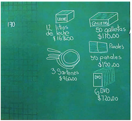 Conforme a los datos de la imagen 2, la estructura de los cinco problemas propuestos es la misma: “Se conoce el costo total de varios artículos o productos iguales, así como el número de artículos”, y se pregunta “cuánto costará uno sólo de los artículos”. Esta pregunta -que el profesor no proporciona por escrito, pero que aparece en el libro de texto- completa la información de los problemas. Es decir que, conociendo el costo de varios productos, se busca el valor unitario de estos. De tal modo, los problemas planteados se convierten en ejercicios (tareas para las que ya se sabe la estrategia de solución) porque, además, el profesor resuelve el de las galletas “para poner un ejemplo” y el resto -al ser todos de estructura similar- los resuelven los niños siempre utilizando el algoritmo de la división.5
