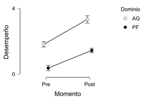 Para examinar correctamente las interacciones en un modelo de análisis de varianza, se utilizan análisis post-hoc. Este procedimiento determina un criterio de significancia más exigente que el convencional p<.05 para reducir la probabilidad de encontrar falsos positivos cuando se hacen muchos tests al mismo tiempo. En nuestro caso, hicimos los análisis post-hoc con correcciones Bonferroni para evaluar los efectos de los niveles del factor momento dentro de cada nivel del factor dominio. No hubo cambios del pre al post en el dominio aritmética generalizada