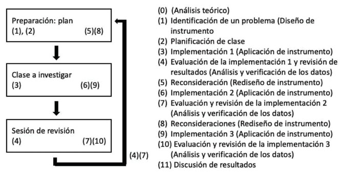 El proceso tomó como base el diagrama de flujo propuesto por Stigler y Hiebert (1999), pero considerando que las tres grandes fases metodológicas: kyozai kenkyu (diseno), koukai/kenkyu jyugyo (implementación) y jyugyo ken-toukai (revision) se pueden repetir tantas veces como se estime conveniente, decidimos aplicar estas fases metodológicas una vez más de lo que contiene el diagrama de Stigler y Hiebert (1999). A este proceso, se acoplaron las tres componentes del ciclo metodológico que sugiere la teoría APOE: el análisis teórico, el diseño y aplicación de enseñanza y el análisis y verificación de los datos (figura 2).