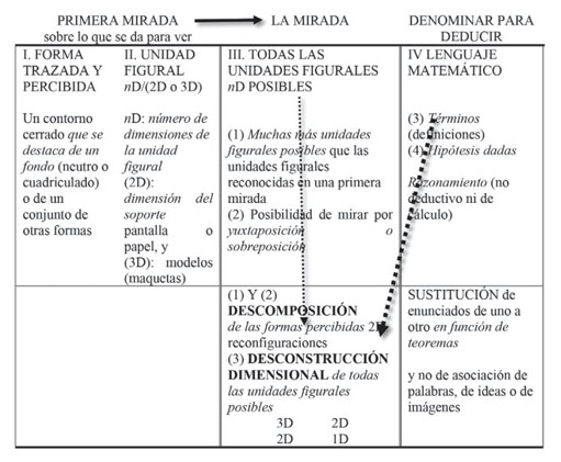 Ante una figura geométrica o un cuadro, los procesos de reconocimiento que controlan la mirada son cognitivamente complejos. Estos procesos no son los de la percepción de los objetos de nuestro entorno, ni los relacionados con la coordinación de los registros. Pero requieren el despliegue de transformaciones semióticas específicas de los registros de representaciones bidimensionales. El análisis comparativo necesario en geometría para “ver” las formas de una figura y las habilidades que se requieren para ver una pintura han permitido distinguir operaciones cognitivas comunes que se basan en las formas percibidas, es decir, en las unidades figurales que surgen de la estructura geométrica de la figura o de la composición de la pintura. Las transformaciones puramente figurales son como metamorfosis del reconocimiento a las cuales las unidades figurales pueden dar lugar en la mirada, sin necesidad de distinguir lo que se vea en el papel, en el lienzo o en la pantalla.