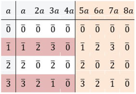 | Idea matemática | Grafo cíclico de orden 4 | 4 subconjuntos de ℤ, cuya unión disjunta es ℤ, dada la división por 4 y los restos generados | 4 clases de