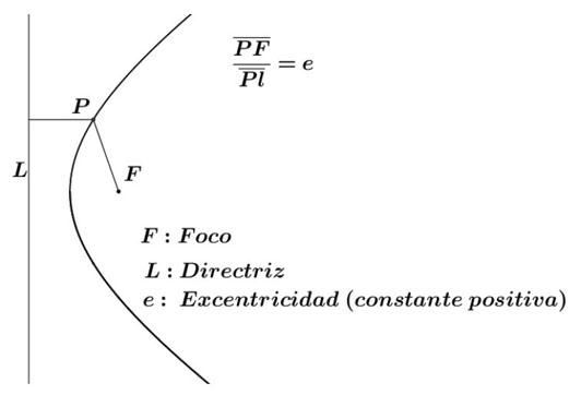 La parábola, elipse e hipérbola, se definen de manera unificada en términos de un foco y una directriz. Una cónica es el lugar geométrico de los puntos P de un plano, tal que la razón de la distancia de P a un punto fijo F , llamado foco, a la distancia de P a una recta L , llamada directriz, que no contiene F , es una constante positiva (figura 3). Esta constante es definida como la excentricidad de la cónica (ver, por ejemplo, Edwards y Penney, 1994, p. 536-537; Simmons, 1996, p. 552). La curva es una elipse si 0<e<1; una parábola si e=1, y una hipérbola si e>1. La definición de Leithold (1981) difiere con la anterior al considerar que puede tomar el valor cero, así tenemos 0e<1, y expresa “cuando e=0 tenemos un punto” (p. 589). Es notable que en este acercamiento el círculo está excluido.