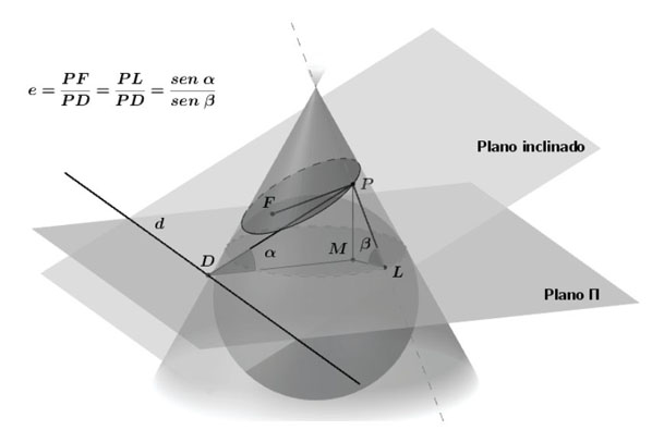 La excentricidad tampoco está involucrada en estas definiciones de las curvas, aparece en el contexto de una proposición, la cual describimos a continuación: Consideremos un cono doble circular recto infinito con un plano inclinado que lo corta. Construyamos una esfera inscrita en el cono, tangente al cono y al plano inclinado (figura 5). El punto de tangencia F de la esfera y el plano inclinado le llamaremos foco de la curva. El conjunto de puntos de tangencia de la esfera y el cono es una circunferencia que determina un plano al que llamaremos plano Π; este plano corta al plano inclinado en una recta d que llamaremos directriz de la curva. La excentricidad de la curva es el cociente que se obtiene al dividir la distancia al foco F desde cualquier punto P de la curva entre la distancia de este punto P a la recta d . Esta razón es constante y es igual a sen/senβ, donde es el ángulo entre el plano inclinado y el plano П, y β es el ángulo entre un plano perpendicular al eje del cono y la generatriz del cono que pasa por (figura 5). La prueba de esta proposición se debe al matemático francés Germinal Pierre Dandelin y podemos encontrarla en Brannan et al. (2012, p. 22) y Simmons (1996, pp. 551-552). En esta definición de excentricidad está implícito que es diferente de cero, lo que garantiza la existencia de la directriz. A medida que el ángulo disminuye y se aproxima a cero, la directriz se aleja más de la cónica y la cónica se vuelve cada vez más “redonda”. En este enfoque, el valor cero de la excentricidad solo puede entenderse como un valor límite, y se asigna al círculo, pues éste sería el límite de las elipses correspondientes.