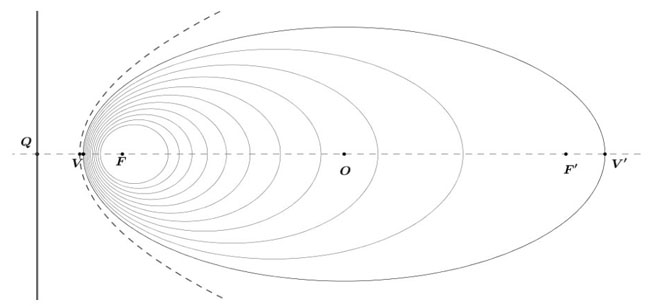 Si elegimos estos valores para u y v obtenemos un punto sobre la elipse pues ciertamente de (1) y (2) obtenemos u/v=e. Llamaremos a este punto. Sobre la semirrecta QF que contiene a V también hay un segundo punto V' de la elipse. En efecto, sea V' un punto sobre la semirrecta QF que no esté en el segmento QF-; denotemos por 2a la longitud del segmento VV'-. La distancia entre V' y F es entonces 2a-u, y la distancia de V' desde L es 2a+v, así que para que V' esté sobre la curva es necesario y suficiente que se cumpla